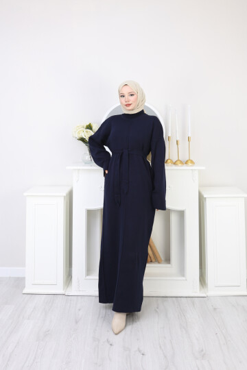 ÇIMALI UZUN KUŞAK DETAYLI ELBİSE-LACİVERT